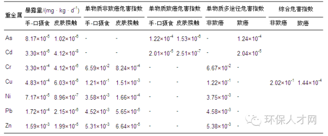 基于健康風險評價模型及相關(guān)參數(shù)指標,利用污泥中重金屬檢測結(jié)果對污泥的重金屬健康風險進行評價,兒童健康風險評價結(jié)果與成人健康風險評價結(jié)果分別如表 9和表 10所示.對于目標暴露人群為兒童,以手-口攝食為暴露途徑時,單一物質(zhì)非致癌危害指數(shù)高的元素是Cu,危害指數(shù)為1.21×10-1;以皮膚接觸為暴露途徑時,單一物質(zhì)非致癌危害指數(shù)高的元素同樣是Cu,其危害指數(shù)為1.51×10-3,各重金屬對非致癌風險貢獻率從高到低的順序是Cu > Cr >Zn> Pb > Ni.污泥重金屬非致癌綜合危害指數(shù)為2.02×10-1,致癌綜合危害指數(shù)為1.44×10-4,其中,以手-口攝食為暴露途徑時,其非致癌與致癌風險分別是2.00×10-1和1.42×10-4,以皮膚接觸為暴露途徑時,其非致癌與致癌風險分別是2.62×10-3和1.78×10-6,手-口攝食暴露途徑為主要的暴露途徑.本次污泥金屬健康風險評價研究中,非致癌綜合危害指數(shù)為1.09×10-1,并未達到非致癌風險警戒值“1”,對于兒童來說并不存在非致癌風險;污泥重金屬致癌綜合危害指數(shù)為1.44×10-4,超出USEPA提供的可接受區(qū)間(1×10-4 ~ 1×10-6),存在一定的致癌風險.但需要指出的是,為了揭示大的致癌風險值,該研究是假設(shè)長期生活在布滿污泥的環(huán)境中,因此,實際生活中,可能并不存在致癌風險.